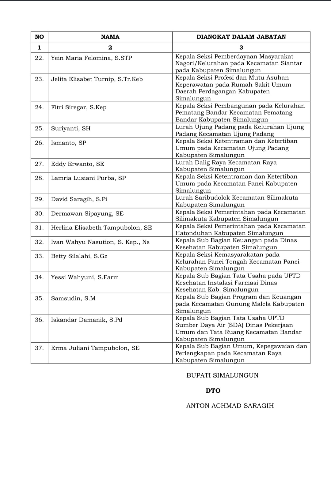 Sebagai saksi dalam pelantikan Staf Ahli Bupati Bidang Perekonomian dan Pembangunan, Debora DPI Hutasoit; Kepala Badan Kepegawaian Pengembangan Sumber Daya Manusia (BKPSDM), Jon Rismatuah Damanik; serta rohaniwan dari agama Islam, Kristen Protestan, dan Katolik.