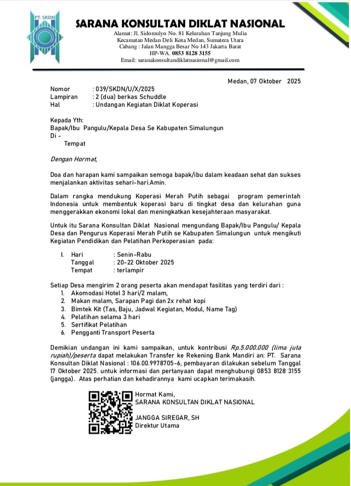 Sebelumnya informasi yang dihimpun wartawan, kegiatan yang diduga berawal dari surat undangan pertama yang dilayangkan oleh PT SKDN bernomor 037/SKDN/U/X/2025 perihal undangan kegiatan diklat koperasi tertanggal 6 Oktober 2025 dengan tujuan Pangulu Sekabupaten Simalungun yang seharusnya dilaksanakan pada 13-15 Oktober 2025. Namun belum diketahui penyebabnya kegiatan yang sudah direncanakan diundur menjadi tanggal20-22 Oktober 2025. Hal itu tertuang didalam sebuah surat undangan yang diduga merupakan bagian yang tidak terpisahkan dari surat sebelumnya yang diterbitkan PT SKDN dengan nomor 039/SKDN/U/X/2025 perihal undangan kegiatan diklat koperasi tertanggal 11 Oktober 2025 dengan tujuan surat masih kepada Pangulu Sekabupaten Simalungun.