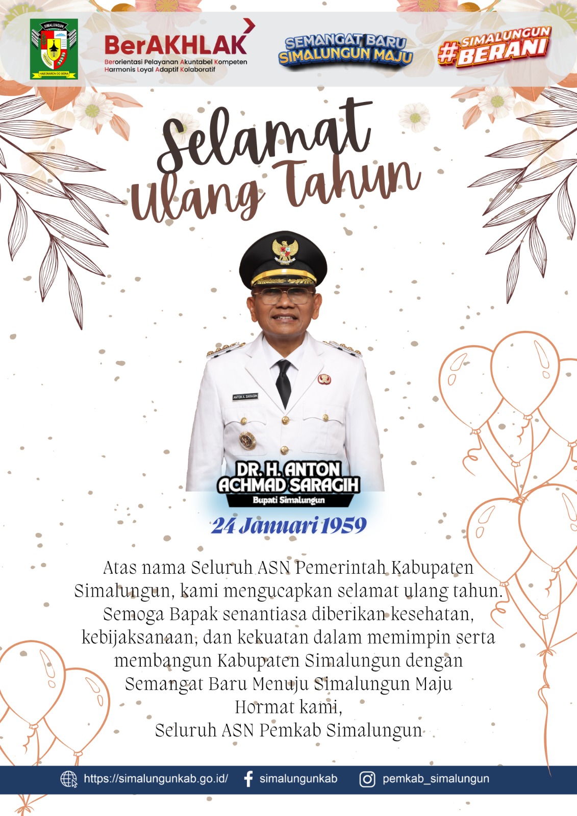 Siberjurnalis.co.id || SIMALUNGUN – Selamat ulang tahun Bapak Bupati Simalungun, semoga Allah Swt senantiasa melimpahkan kesehatan, kebahagiaan dan keberkahan dalam setiap langkah pengabdian untuk masyarakat, semoga Allah Swt senantiasa melimpahkan kekuatan dan amanah dalam memimpin Kabupaten Simalungun yang kita cintai ini.