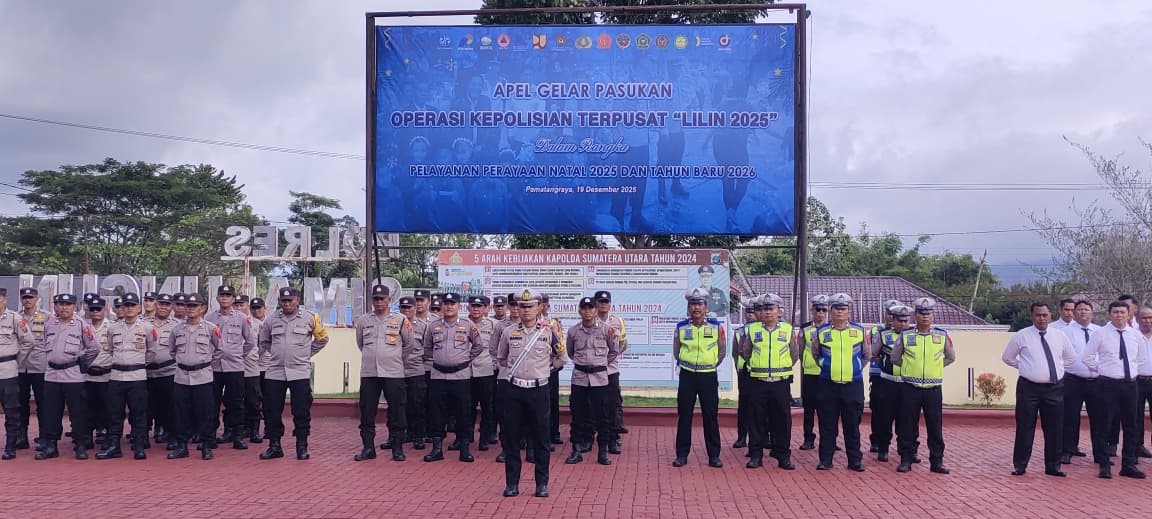 Siberjurnalis.co.id || SIMALUNGUN – Pasukan siap, semangat membara! Kapolres Simalungun AKBP Marganda Aritonang, SH, SIK, MM memimpin Apel Gelar Pasukan Operasi Kepolisian Terpusat “Lilin Toba 2025” dalam rangka pengamanan Hari Natal 2025 dan Tahun Baru 2026 di wilayah Kabupaten Simalungun. Jumat, 19 Desember 2025 pukul 10.00 WIB, Lapangan Apel Mako Polres Simalungun di Jalan Jon Horailam Saragih No 110 Pematang Raya dipenuhi ratusan personel gabungan TNI-Polri dan instansi terkait yang siap bertugas menjaga keamanan dan kenyamanan masyarakat.