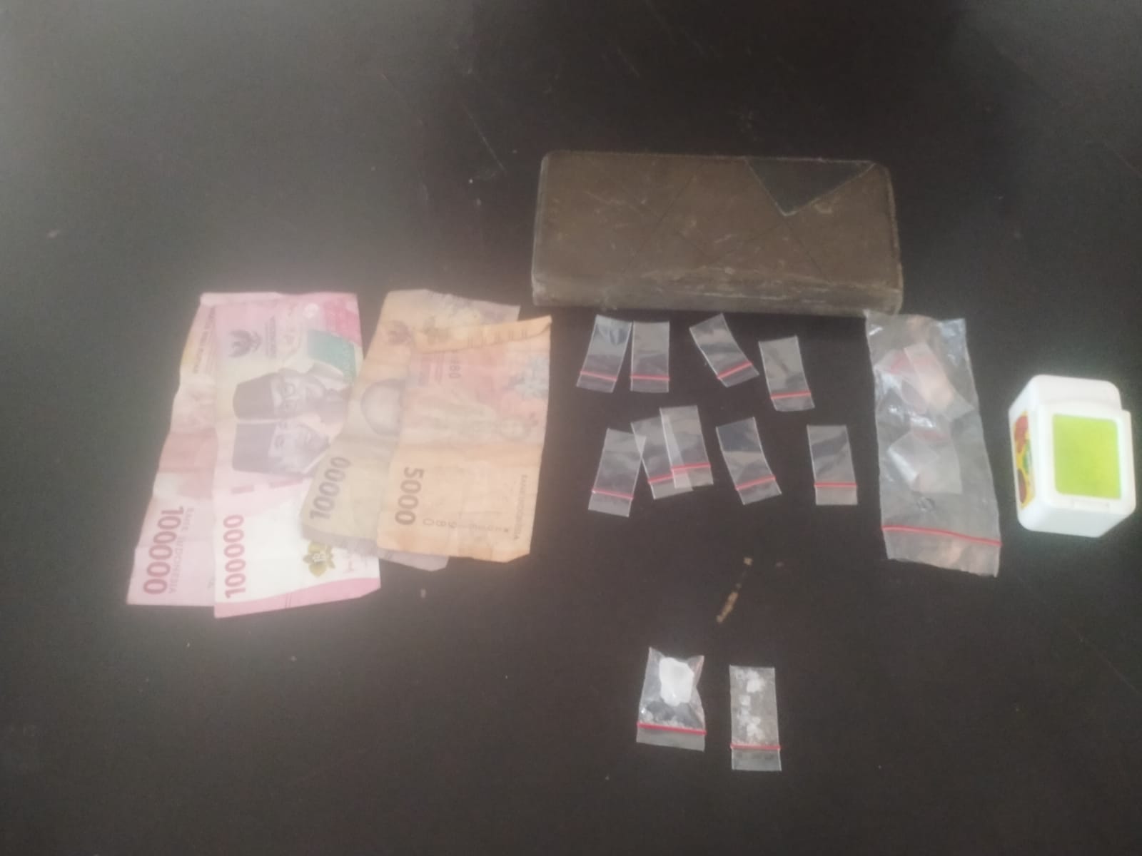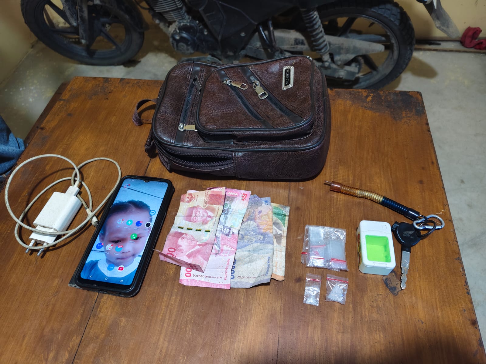 Petugas juga mengamankan 1 buah tas sandang berwarna coklat berisi uang tunai Rp215.000 diduga hasil penjualan narkoba, 1 unit handphone merek Vivo warna hitam, dan 1 buah charger berwarna putih. Sepeda motor Honda CB 150 warna hitam yang digunakan tersangka juga diamankan sebagai barang bukti.